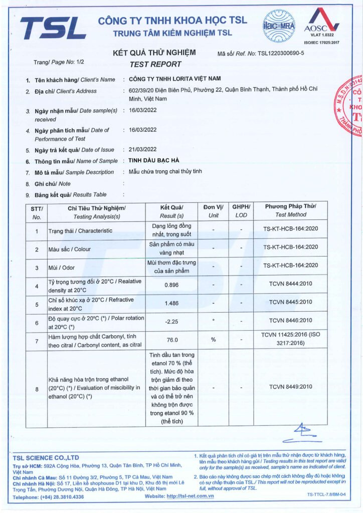 Toàn bộ hồ sơ kiểm nghiệm tinh dầu thiên nhiên của LORITA đều có thể được cung cấp khi khách hàng yêu cầu. Chúng tôi cam kết không che giấu – không nói quá – không quảng cáo sai sự thật.